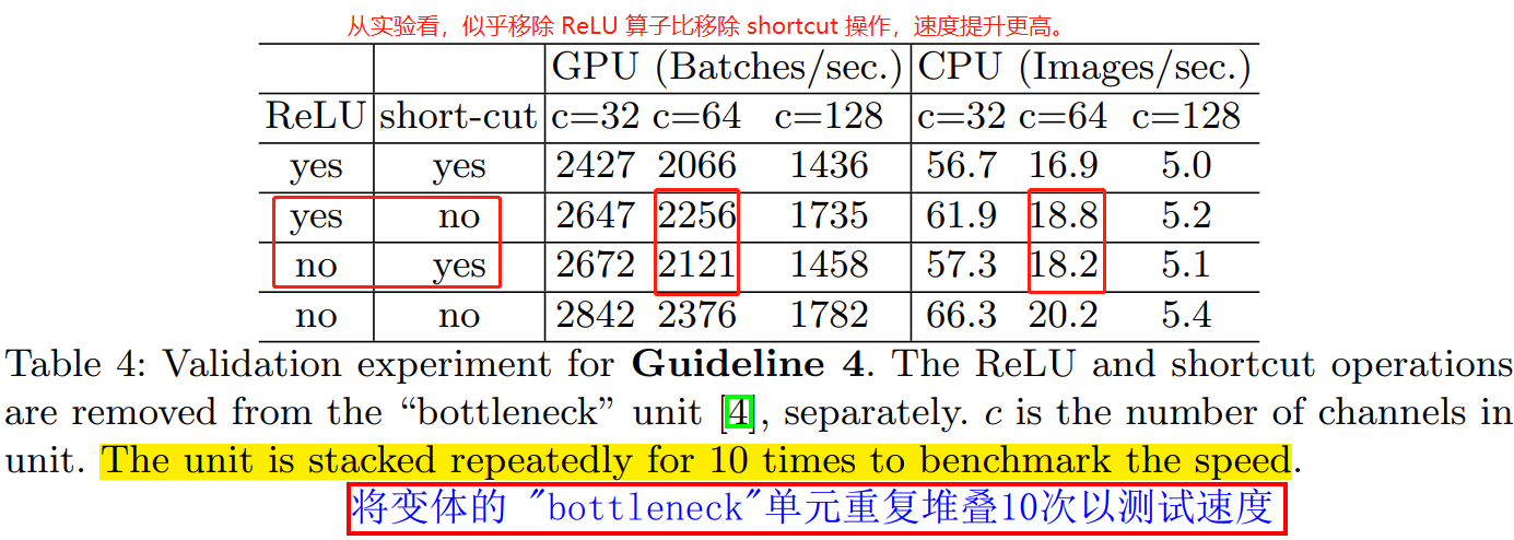 论文使用 ResNet 的 “bottleneck” 单元进行实验,其是由 $1 \times 1$ 卷积、然后是$3 \times 3$ 卷积,最后又是 $1 \times 1$ 卷积组成,并带有 ReLU 和 shortcut 连接,其结构图如下图所示。在论文的实验中,删除 ReLU 和 shortcut 操作,表 4 报告了不同变体 “bottleneck” 的运行时间。我们观察到,在删除 ReLU 和 shortcut 后,在 GPU 和 CPU 平台都取得了 20% 的加速。