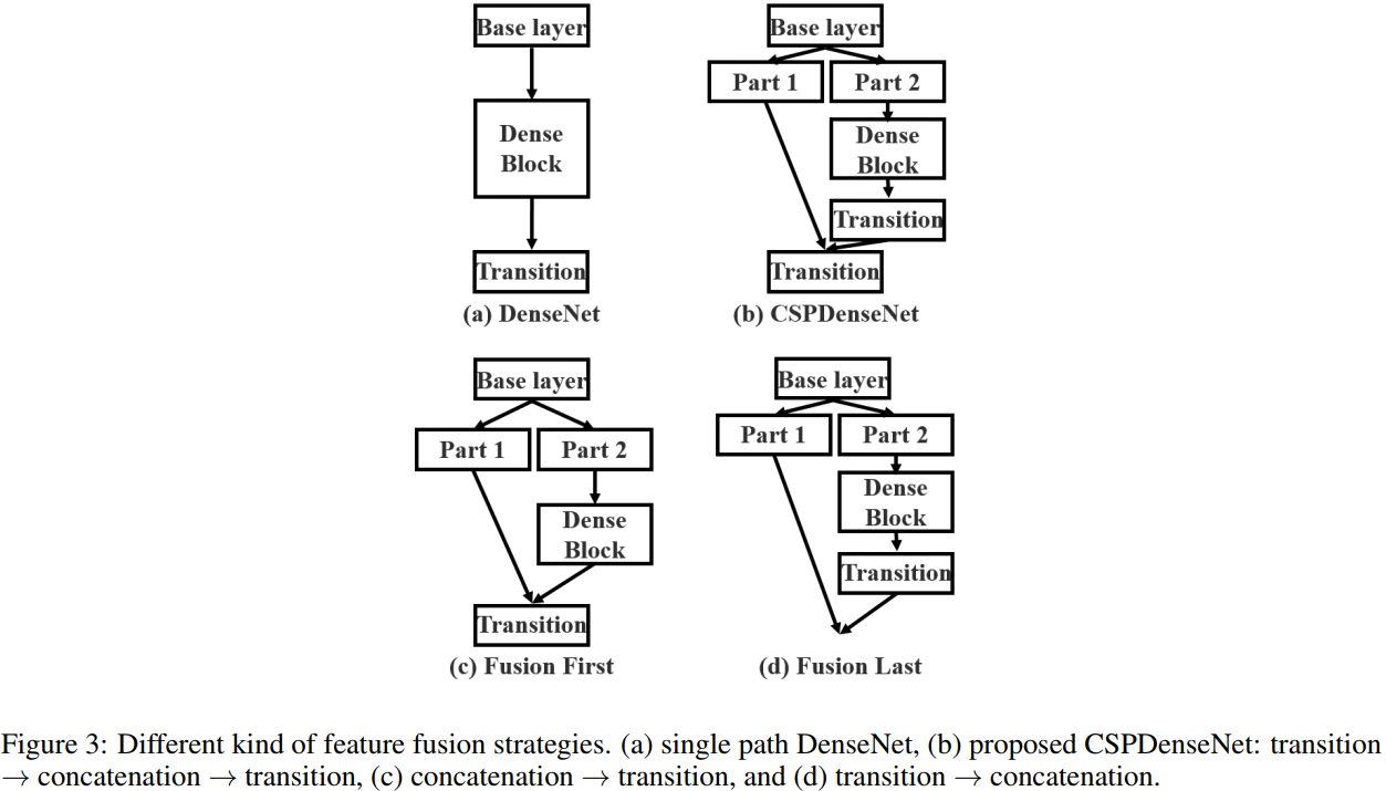 - (d) 图 Fusion Last 的方式,先将部分特征输入 Transition layer,然后再进行concatenate,这样梯度信息将被截断,损失了部分的梯度重用,但是由于 Transition 的输入维度比(c)图少,大大减少了计算复杂度。