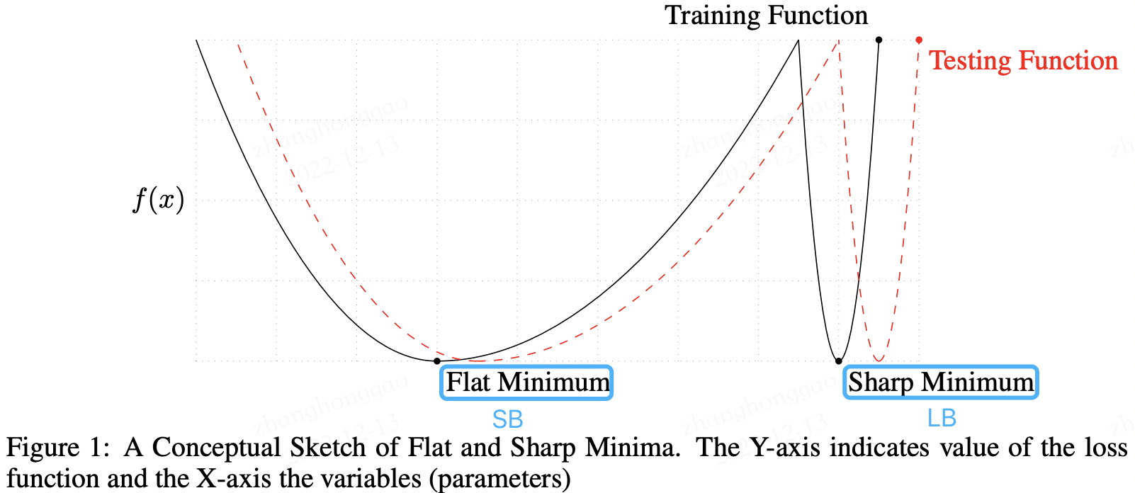 有论文指出 LB(Large batch size)之所以出现 Generalization Gap 问题,是因为 LB 训练的时候更容易收敛到 sharp minima,而 SB (Small batch size)则更容易收敛到 flat minima,并且 LB 还不容易从这些 sharp minima 中出来,另外,作者认为关于 batch size 的选择是有一个阈值的,一旦超过这个阈值,模型的质量会退化,网络的准确度大幅下降。