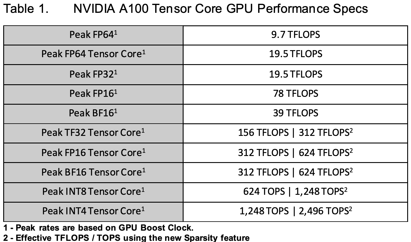 | A100 SXM | Ampere | 9.7 TFLOPS | 19.5TFLOPS | 19.5TFLOPS | 156 TFLOPS/312 TFLOPS* | 312 TFLOPS/624 TFLOPS* | 312 TFLOPS/624 TFLOPS* | 624 TOPS/1248 TOPS* | 80GB HBM2e | 2039GB/s |