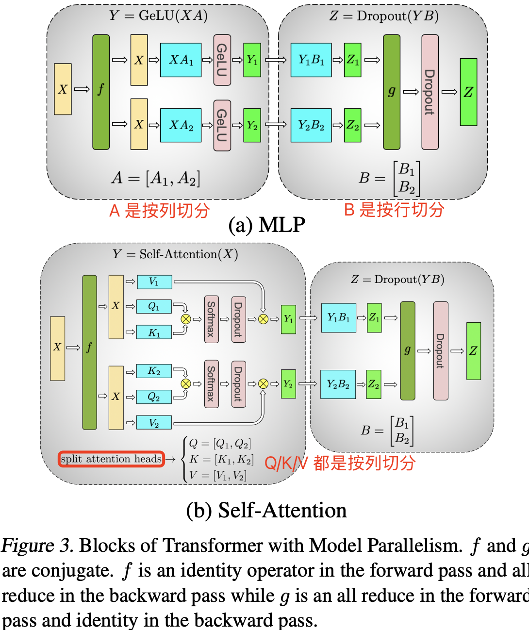 \[[Y1, Y2] = [GeLU(XA1), GeLU(XA2)\]将第一个线性层的权重按照列并行方式切分后,第二个线性层的权重矩阵 B 自然沿着行方向拆分,使其能够直接处理来自 GeLU 层的输出而无需任何通信,如图 3a 所示。